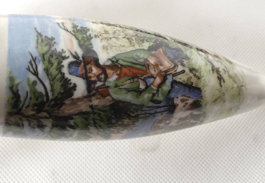 Cybuch porcelanowy zdobiony myśliwym z psem .