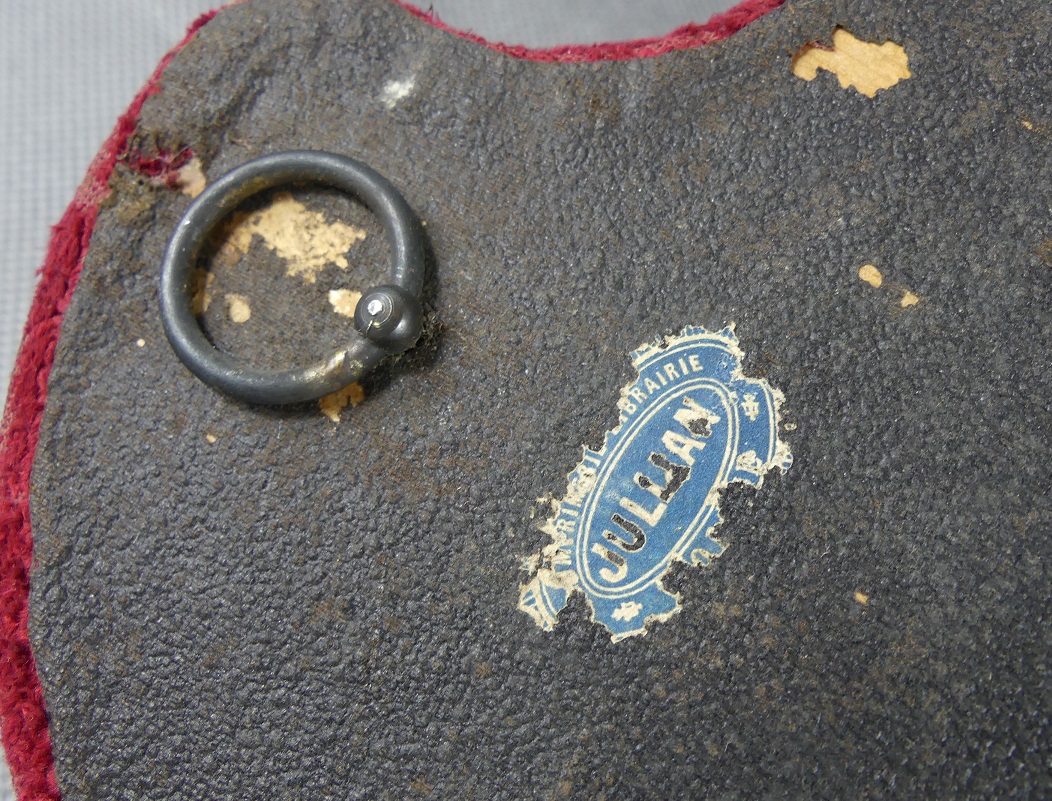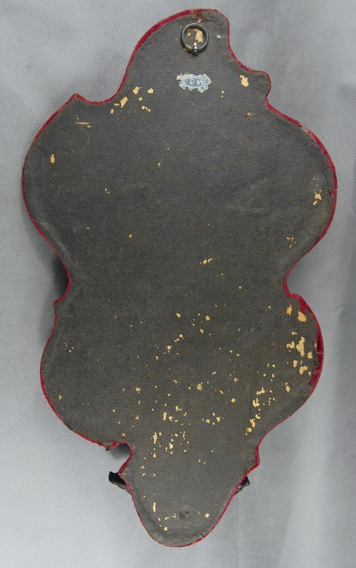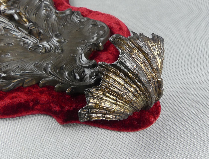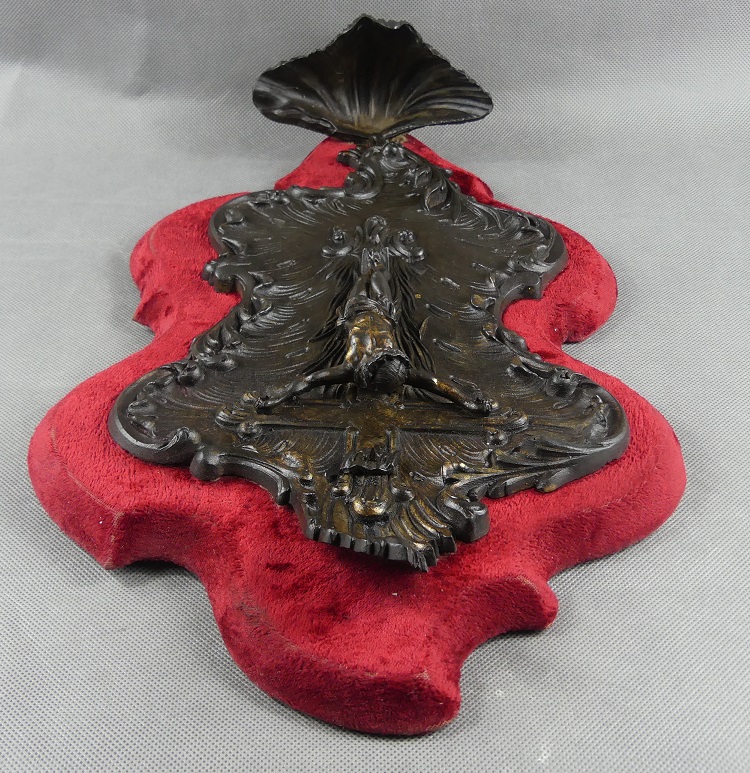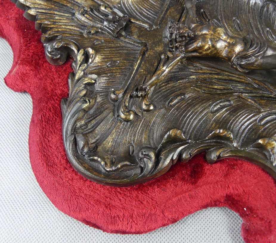 Wykonana z cynkalu osadzona na drewnie obitym welurem.