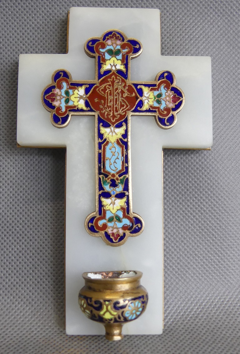Wykonana z alabastru – krzyż oraz pojemnik na wodę zdobiony emalią komórkową – cloisonne .