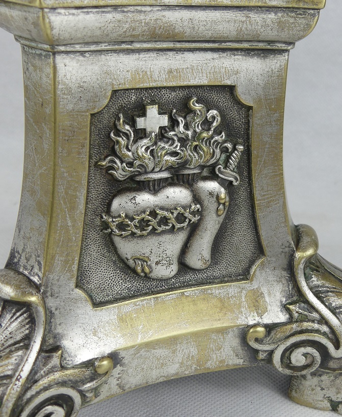 Oparty na trójnożnej podstawie bogato zdobionej – MARYJA JEZUS , SERCE JEZUSA .